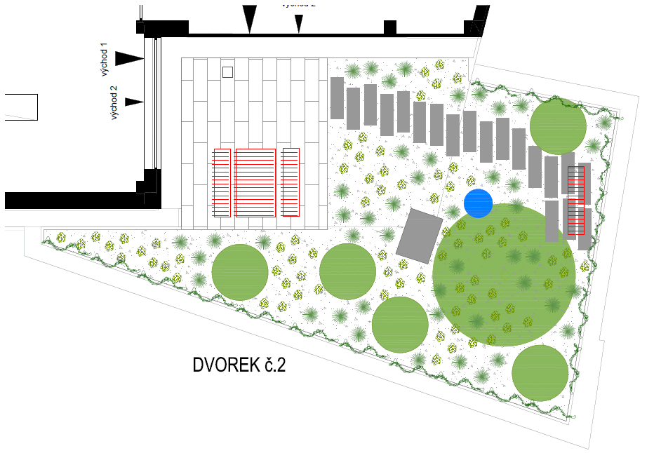 Ve vnitrobloku několikapatrové administrativní budovy v centru Brna, kterou čeká rekonstrukce, se nacházejí dva dvorky, které by se mohly využít jako odpočinková zahrada pro zaměstnance přilehlých kanceláří. Zahrnuto je několik odpočívadel od firmy Egoe Life umístěných na zpevněných plochách, obklopených zelení stávajících a nově vysazených stromů, podsázených trvalkami, solitérními keři a popínavými dřevinami. K těmto plochám je i řešena extentzivní střešní zahrada.